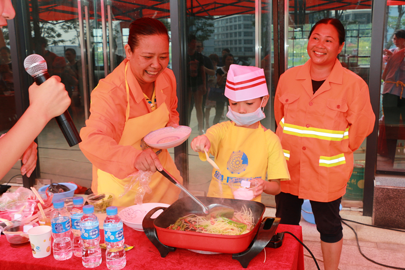 搶答活動結(jié)束之后,進入“小廚神”廚藝大比拼環(huán)節(jié)。由園林綠化工人、水電維修物業(yè)工人、保潔人員等進城務(wù)工人員組成的5組家庭展開了激烈的廚藝大比拼競賽???,小廚神們在父母的指導(dǎo)下井井有條地備菜、炒菜、起鍋,忙得不亦樂乎。各色菜式色香味俱全,充分展現(xiàn)了孩子們“小當(dāng)家”的本領(lǐng)。半小時后,小廚神們在大家的熱烈掌聲中完成了比賽菜品,廚藝大師及現(xiàn)場觀眾根據(jù)完成的速度、菜品、味道等評出廚藝大賽一等獎1名,二等獎2名,三等獎3名,優(yōu)秀獎10名。