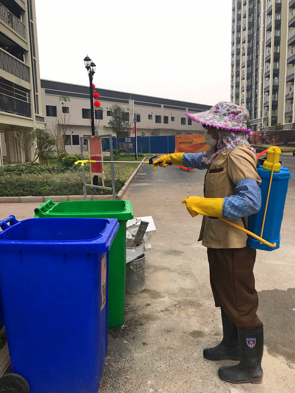 萬方物業(yè)公司正在對園區(qū)進行消毒消殺