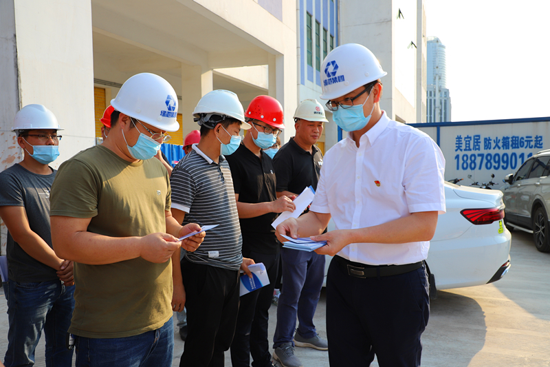綠港集團(tuán)黨委書記、董事長龔國強(qiáng)給項(xiàng)目一線人員發(fā)放《工程建設(shè)廉政手冊》(張彩秀  攝)