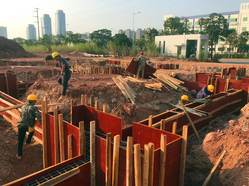瑞聲南寧光學項目主產(chǎn)高精密手機鏡頭,包括一體式VCM雙攝、晶圓級玻璃(WLG)鏡頭、玻塑混合鏡頭等,是瑞聲核心技術之一,項目的盡快投產(chǎn)對于瑞聲公司在美國打壓中國通訊產(chǎn)業(yè)的大環(huán)境下?lián)屨籍a(chǎn)業(yè)鏈轉(zhuǎn)移先機,搶占市場份額;經(jīng)開區(qū)落實自治區(qū)強首府戰(zhàn)略、打造千億產(chǎn)業(yè)園等都有著十分重要的意義,是一個多贏格局。項目計劃2020年2月上旬正式投產(chǎn)。榮鑫公司在該項目中主要承擔附屬工程施工,包括設備用房、污水處理廠房、危品庫、空壓機房主體施工及園區(qū)道路、綠化等,是名符其實的配角,但在項目的前期階段,聚光燈卻始終照在這“配角”的身上。附屬工程中,設備用房、污水處理廠房等建筑面積共4000平方米,是項目裝修、安裝的基礎工程,投產(chǎn)倒排工期要求2019年12月25日前必須完成并交付安裝單位(道路綠化等配合項目總進度,不在此列),工期不足三個月!該部分用房面積雖不大,且大部分只有兩層,但由于特殊設計要求且項目處回填區(qū)域,涉及樁基、深基坑(5.5米)、高支模(8.3米)、防滲防腐等土建施工難點、費時點,不可控因素多,給工程按期完工帶來了極大的困難。該部分項目工程量不大,與后期裝修、安裝關系密切,本應由裝修總包單位統(tǒng)一施工,但裝修單位一再推托,坦言不可能完成。最終管委將此部分項目授與了榮鑫公司。此時,裝修、安裝單位在觀望,業(yè)主、建設主管部門也都在捏把汗。