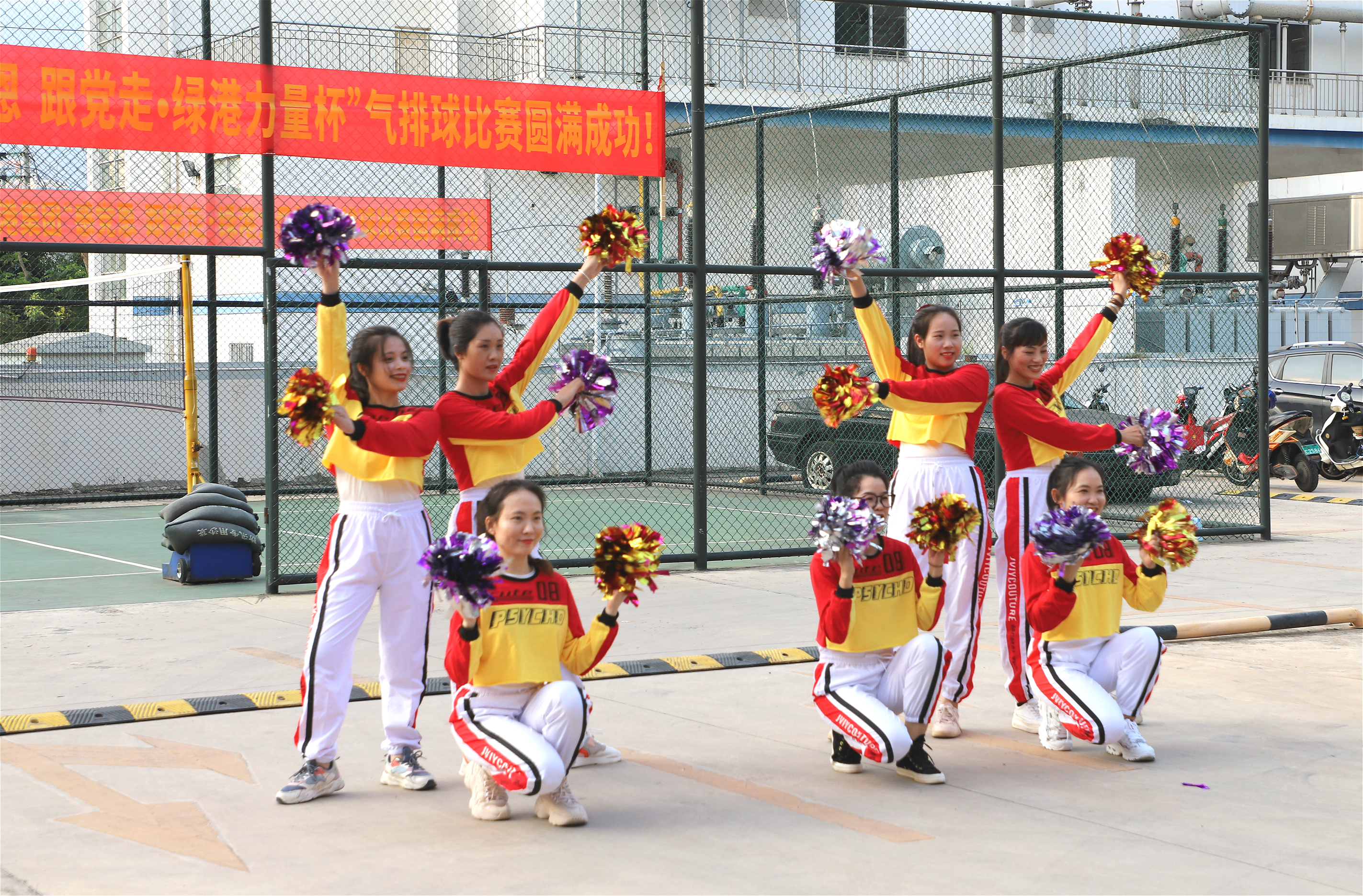 賽場上,運動員們精神抖擻,配合默契,奮力扣球。“好球、好球!”賽場下,啦啦隊員熱情高漲,賽場上的戰(zhàn)況緊緊牽動著他們,每一個得分球都贏得了一陣陣的喝彩聲。大家時而緊張握拳,時而高聲吶喊助威。青春活力的綠港女神們現(xiàn)場表演的啦啦操更是將氣氛推向頂點。