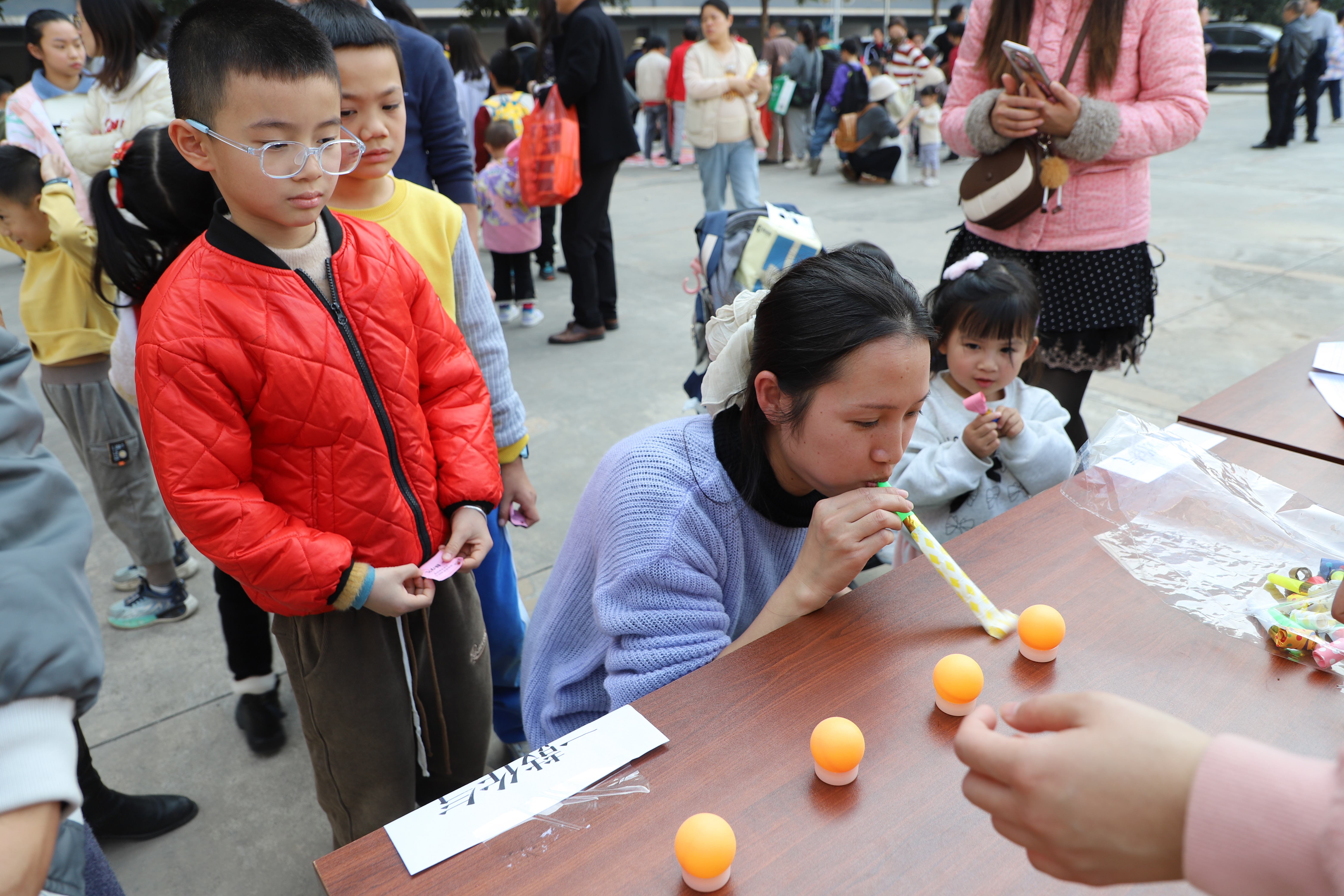 “一鼓作氣”游戲中,小伙伴們鼓足腮幫子,用力吹氣,奮力吹倒一排乒乓球,“太棒了!”周圍的觀眾紛紛鼓掌歡呼。