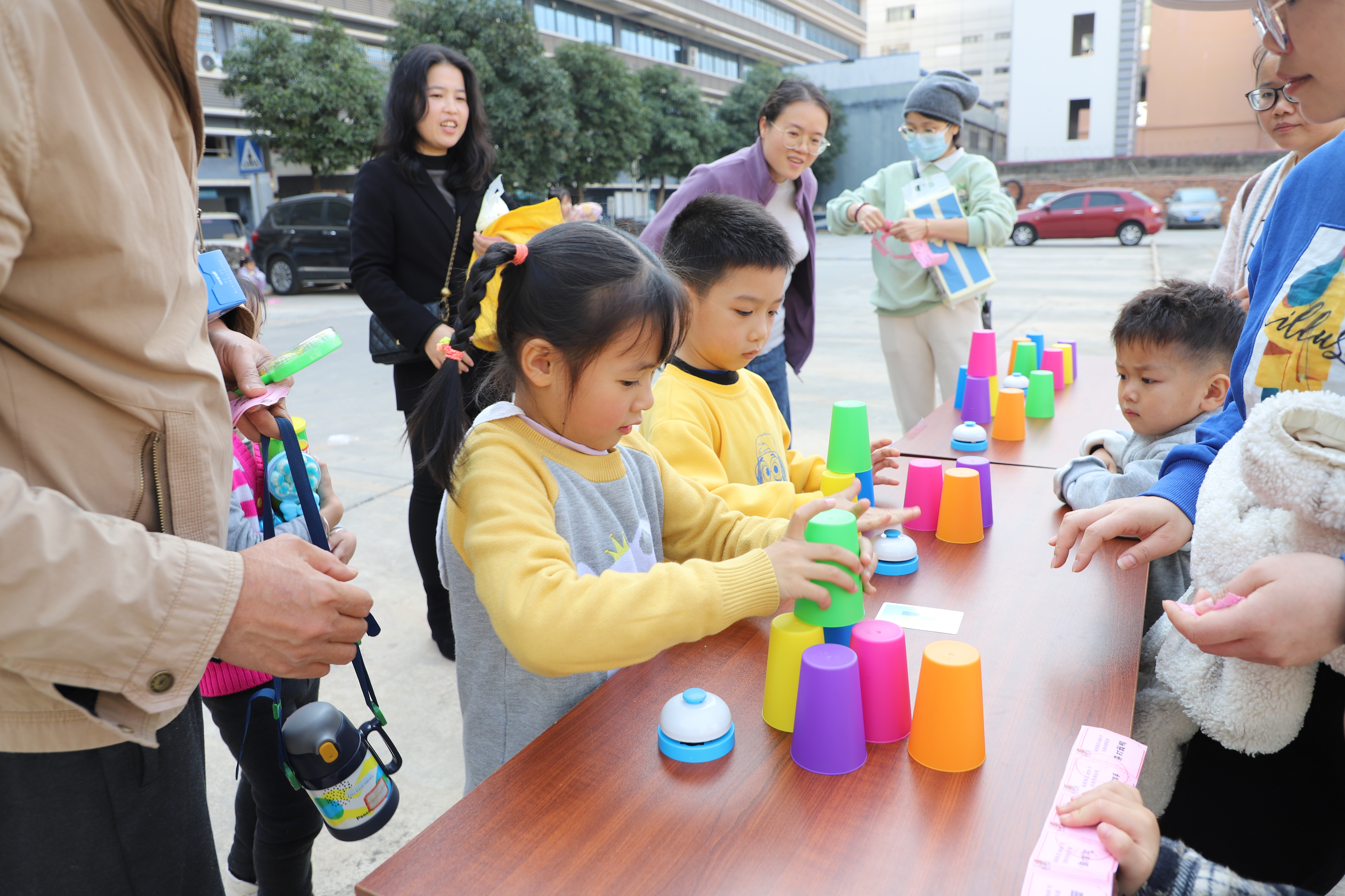 “對戰(zhàn)疊疊樂”則激發(fā)了大家的勝負欲。大家小心翼翼地調(diào)整著杯子的位置,最先按圖案疊好杯子的獲勝。“耶!我贏了!”最先獲勝的小伙伴興奮地歡呼著。