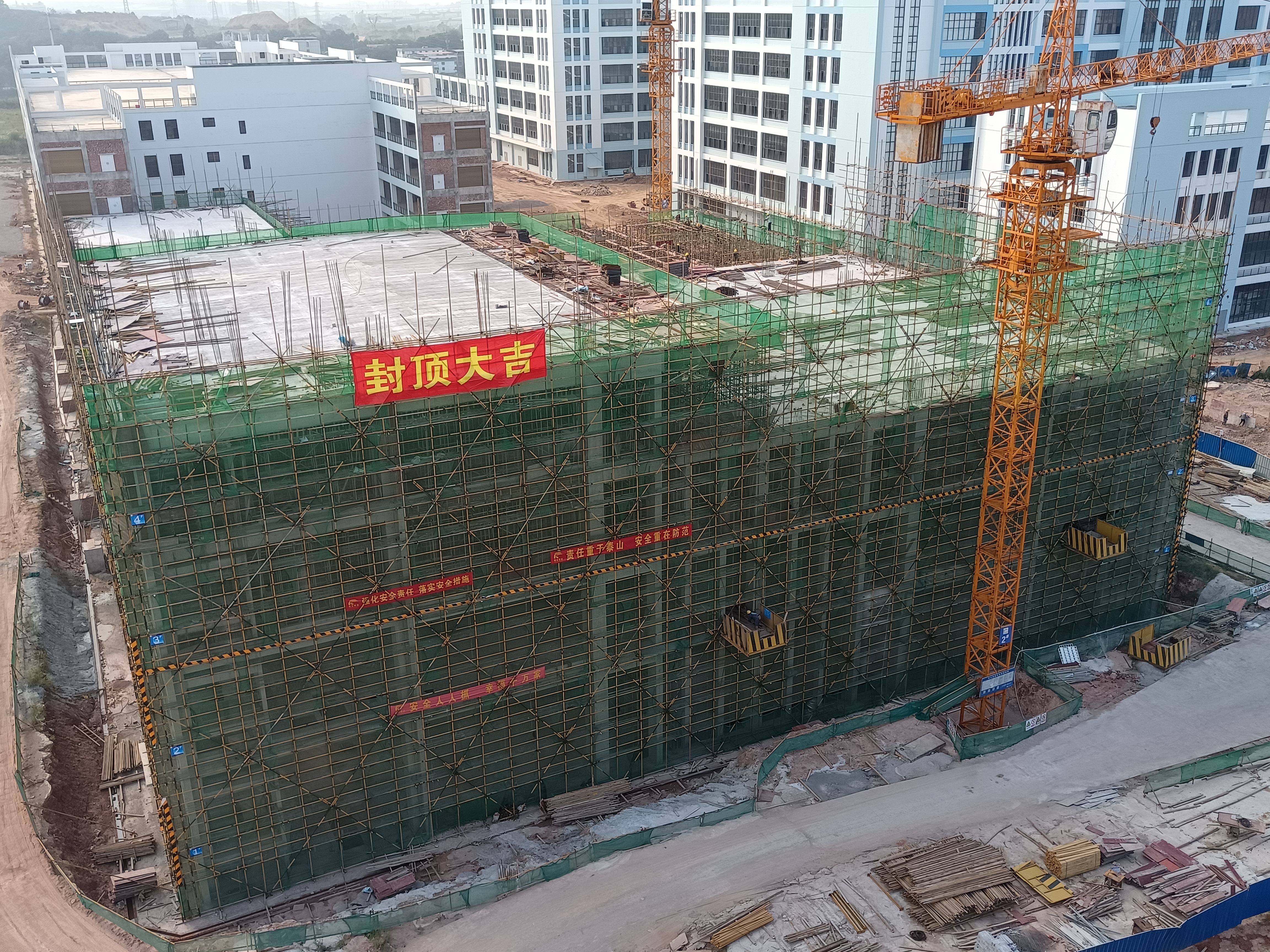 該項目自2022年4月28日正式開工建設(shè)以來,備受各級領(lǐng)導(dǎo)的重點(diǎn)關(guān)注,在綠港集團(tuán)領(lǐng)導(dǎo)的大力支持下,嘉瑞通公司積極組織參建各方團(tuán)結(jié)協(xié)作,從開工開始嚴(yán)抓工程質(zhì)量、進(jìn)度、安全工作,克服雨季、中高考、新冠疫情、地質(zhì)條件差及外界諸多因素的影響,奮力拼搏,晝夜施工,積極協(xié)調(diào)解決項目現(xiàn)場及施工圖紙存在的問題,嚴(yán)格按照既定的目標(biāo)全力推進(jìn)項目進(jìn)度,力爭將項目打造成為一個精品工程。在參建各方的努力下,該項目建設(shè)取得喜人進(jìn)展,9#廠房10~14軸/A~D軸區(qū)段于10月27日順利封頂。