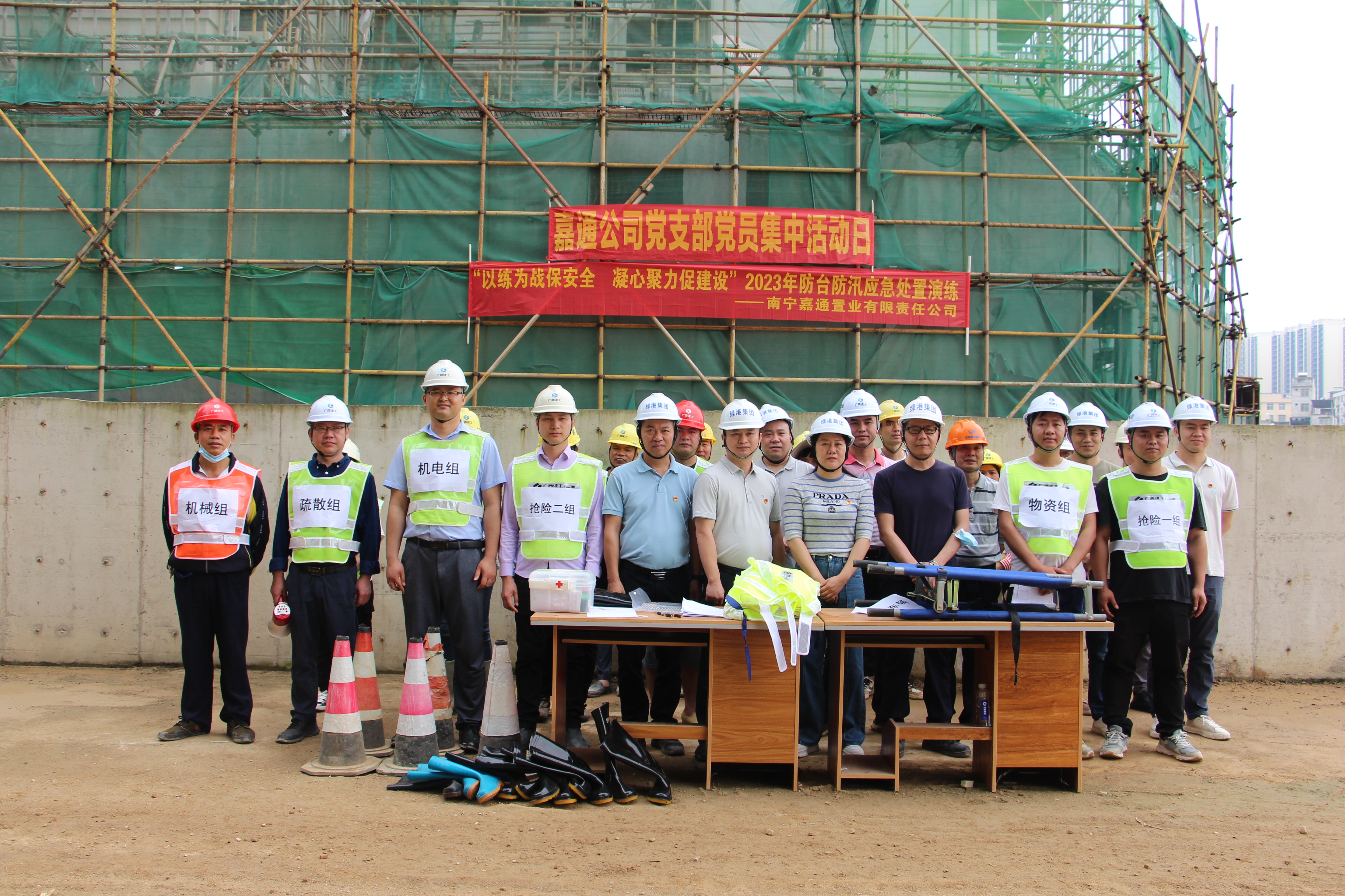 為進(jìn)一步提升項(xiàng)目管理人員應(yīng)對(duì)汛情的應(yīng)急處置能力,提高員工防臺(tái)防汛的安全意識(shí),保障項(xiàng)目現(xiàn)場(chǎng)的設(shè)備和人身財(cái)產(chǎn)安全,4月19日,嘉通公司聯(lián)合施工單位廣西建工第一建筑工程集團(tuán)有限公司在綠港·尚尊一品項(xiàng)目現(xiàn)場(chǎng)開(kāi)展“以練為戰(zhàn)保安全 凝心聚力促建設(shè)”2023年防臺(tái)防汛應(yīng)急處置演練,全面筑牢安全生產(chǎn)防線。綠港集團(tuán)安全監(jiān)督部、項(xiàng)目負(fù)責(zé)人、業(yè)主代表及一線施工人員約30人參加本次活動(dòng)。集團(tuán)黨委委員、副總經(jīng)理黃麗琴到現(xiàn)場(chǎng)觀摩指導(dǎo)并作防臺(tái)防汛工作部署。嘉通公司黨支部書(shū)記、總經(jīng)理何小勇在演練前致辭。